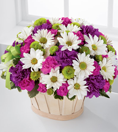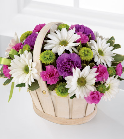 This pretty basket is sure to cheer up anyone's day. This white-wash handled basket is filled with green button pompons, white daisy pompons, hot pink mini carnations and purple carnations. A green ribbon bow completes your best wishes