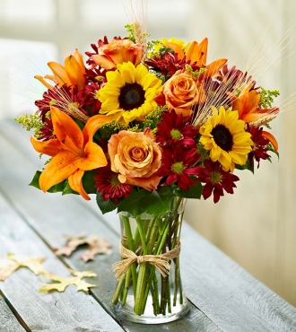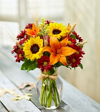 Imagine spending a perfect autumn day browsing the burgeoning flower markets of Europe. It's easy with this abundant arrangement of roses, sunflowers, lilies, daisy poms and dried oak leaves. Flowers may vary due to local availability. Lilies may arrive in bud form and will open to full beauty over the next 2-3 days. * Vase sold separately. *
