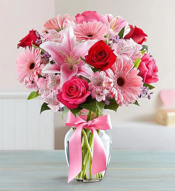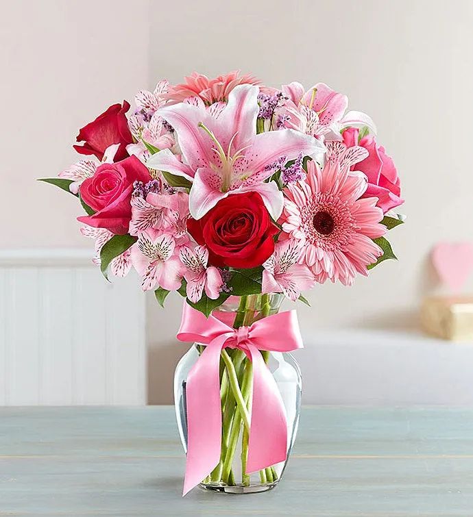 This beautiful pink, red and white bouquet of roses, lilies, gerbera daisies and alstroemeria is sure to please. Our florist's hand-design each arrangement, so colors, varieties, and containers may vary due to local availability. This bouquet comes pre arranged to be placed in a vase.