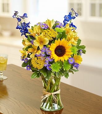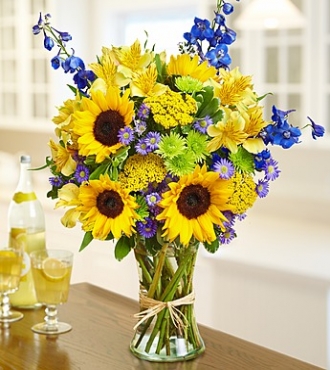 Send some sunshine with this bouquet full of fresh sunflowers, delphinium, alstroemeria, yarrow, monte casino and more! Vase is included. Same day local florist delivery is available. This bouquet comes pre arranged to be placed in a vase. Vase sold separately