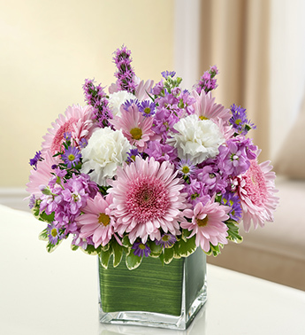 Send a caring message with this comforting arrangement featuring lavender and white blooms. Beautiful roses, lilies, carnations and more are gathered together in a cube vase to make a beautiful tribute to a lost loved one.