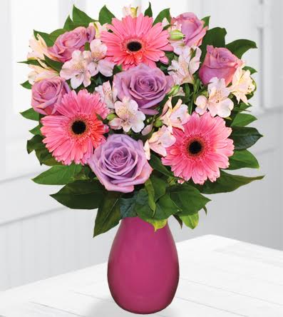 Treat your sweetheart to this beautiful lavender and pink bouquet. Designed in a vase and Surrounded by light pink alstroemeria and greenery, makes this a stunning arrangement for the one you love. This bouquet arrives pre arranged, to be placed directly into the included vase (if purchased). Just add water.