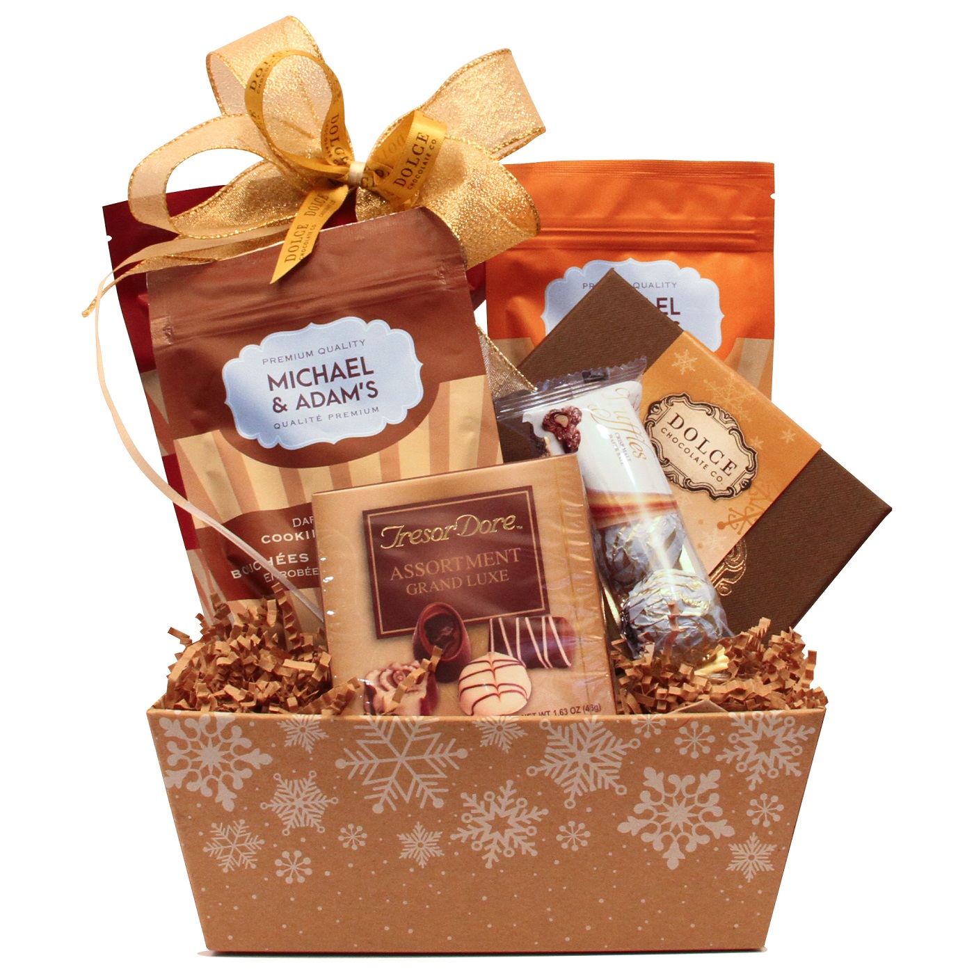 Christmas markets, Christmas lights, beautiful snowfall. This basket embodies the spirit of Christmas and it is filled with delicious treats like chocolate bark, chocolate bites, and so many more! Spread some Christmas cheer into someone's life!