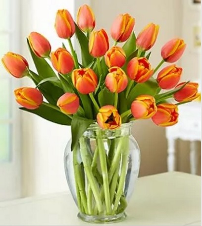 Discover the beauty of a gorgeous sunset with our stunning bouquet of orange tulips. This spring favorite makes a great gift for any occasion! This bouquet arrives pre arranged, to be placed directly into the included vase ( If Purchased ) . Just add water.