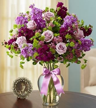 The perfect gift for purple lovers- a lovely gathering of purple and lavender roses, stock and waxflower. A truly beautiful bouquet that makes a great gift for any occasion. This bouquet comes pre arranged to be placed in a vase. Vase sold separately