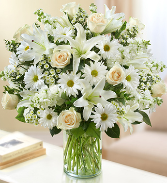 Express your sincere condolences with this classic all-white arrangement of fresh roses, lilies, daisy poms and monte casino. A thoughtful gesture in times of sorrow.