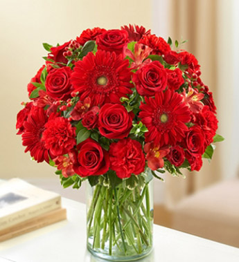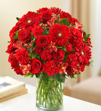 Express your condolences perfectly with the elegant beauty of our abundant all-red arrangement. Traditionally a symbol of courage and strength, filled with lovely roses, gerbera daisies, alstroemeria and carnations. Hand-designed by our florists in a classic vase for a sincere offering of your sympathy.