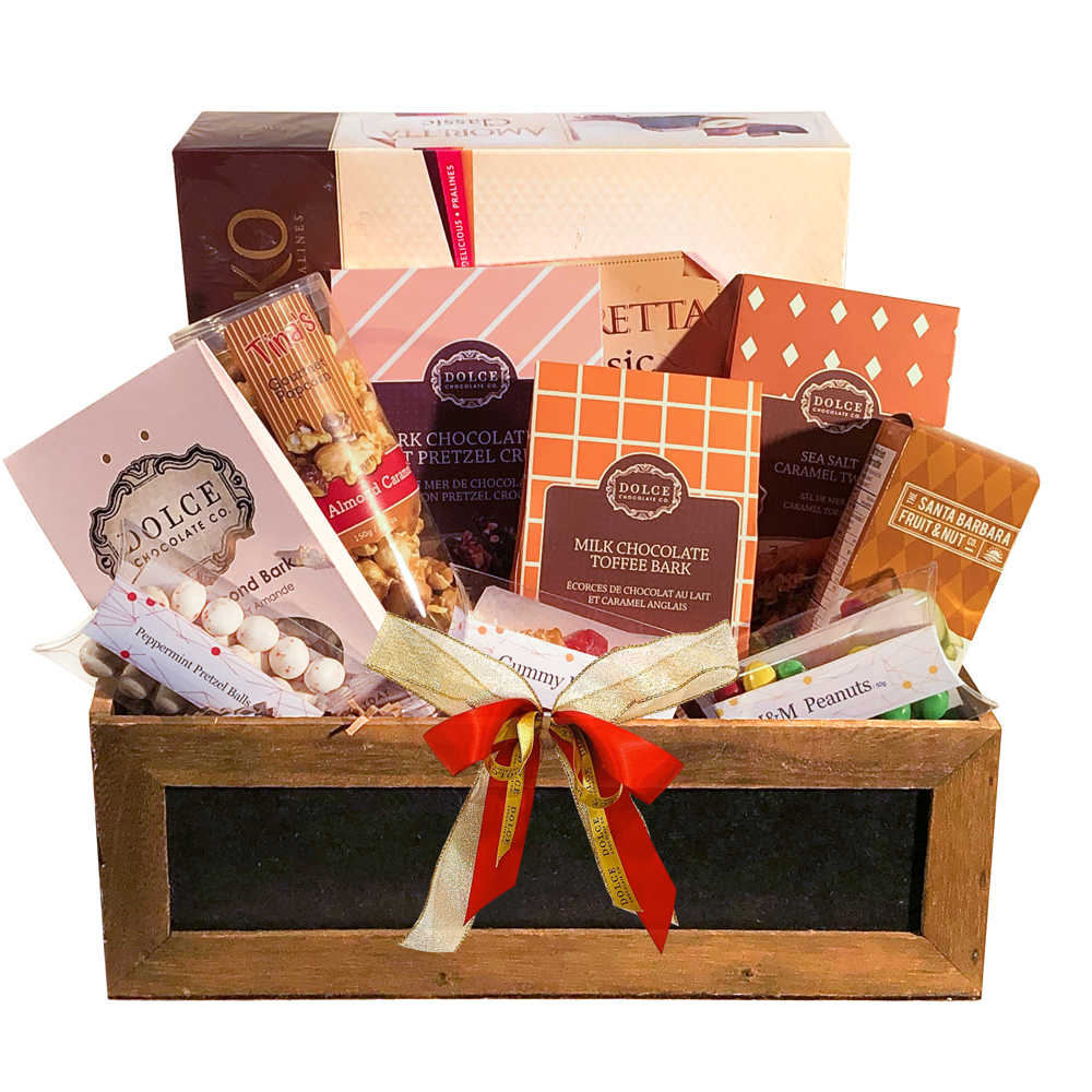 Our Traditional Holidays gift basket is filled with a generous supply of gourmet treats from our quality vendors such as Dolce Chocolate, Miezko, Tina's Popcorn and so many more. The goodies come in a rustic container that is reusable for any kind of storage. All the treats in our Traditional Holidays gift basket are irresistible!