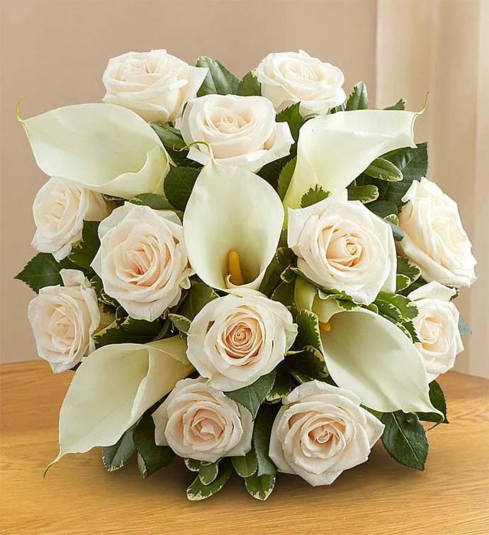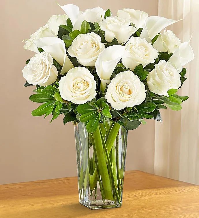 Convey your deepest sympathies with our elegant all-white arrangement. One dozen lovely roses are paired with five calla lilies, creating an expression of graceful beauty during this difficult time.